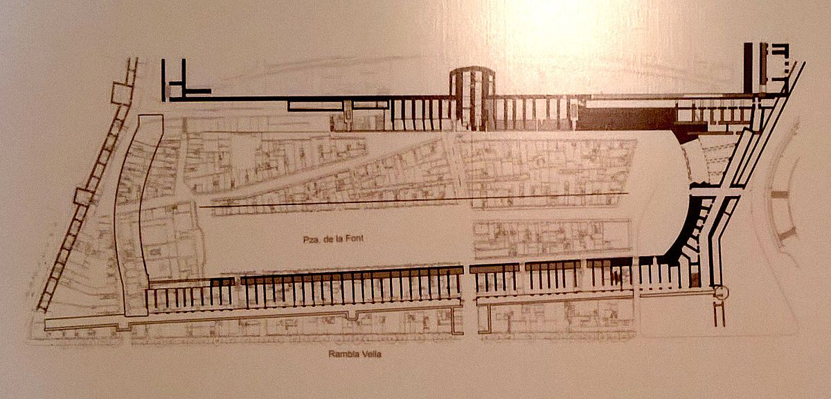 teilweise ausgegrabene tribünen des circus, beginn der überbauung ab dem 5. jhdt. - nördlich der plaza de la font